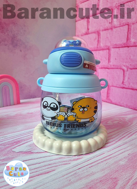 ویژگی های قمقمه : نی دار ، دارای قفل برای محافظت از نی ، دارای بند بلند ، دارای یک خرس بامزه بر روی در