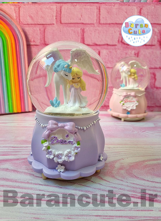 گوی موزیکال پمپی برفی چراغ دار سایز بزرگ طرح فرشته و اسب بالدار یاسی