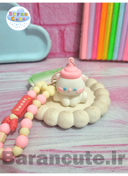 جاکلیدی جاسویچی فانتزی همراه با بند آویز مرواریدی طرح پیشی صورتی