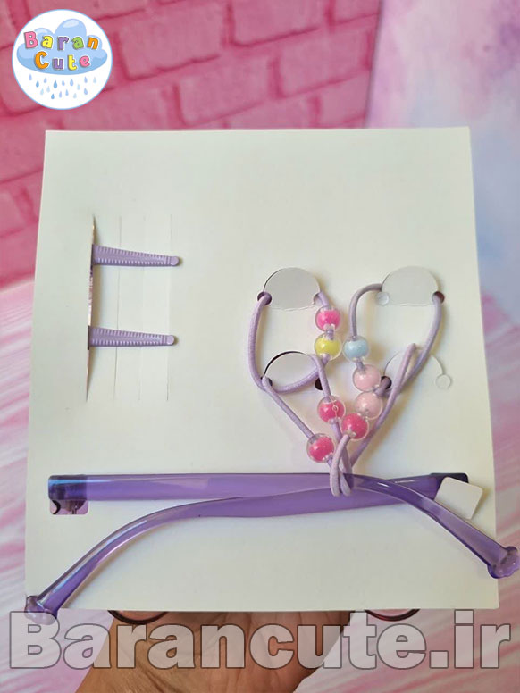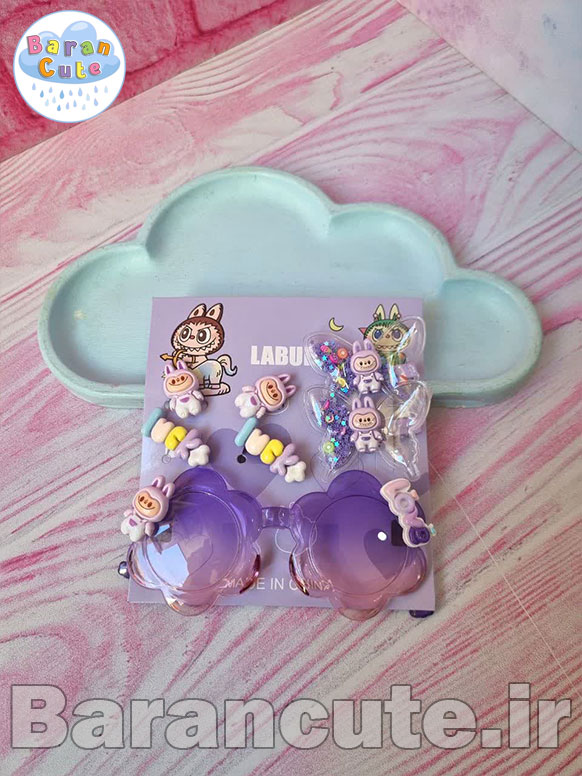 پک عینک آفتابی طرح گل و کش مو و گل سر شاین دار طرح لبوبو یاسی