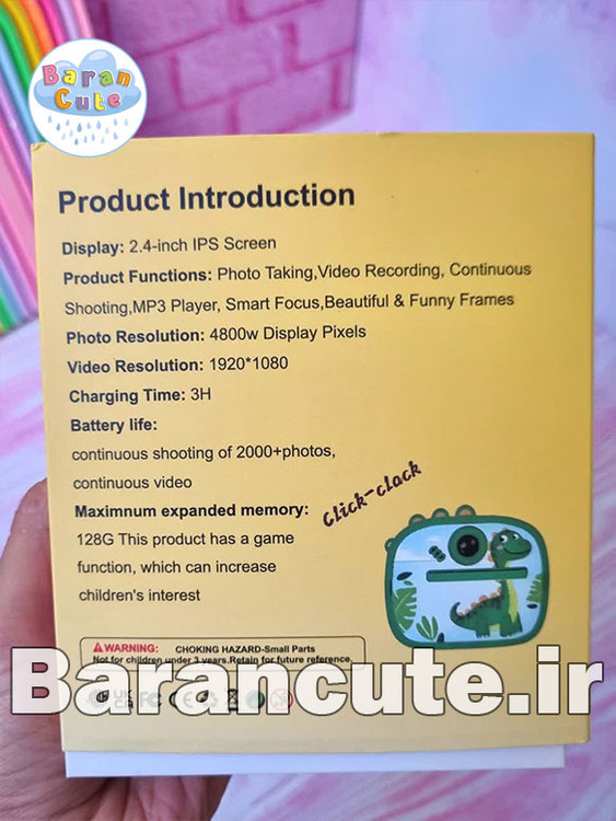 دوربین های بچگانه به دلیل چاپ سریع و کیفیت بالا بسیار برای کودکان جذاب و محبوب بوده است مدل موجود در فروشگاه بسیار حرفه ای در چاپ بوده و علاوه بر گرفتن عکس و ویدئو دارای گیم ، پخش کننده موسیقی و فیلم و دوربین سلفی نیز می باشد دوربین بچگانه یونیکورن و دایناسور دارای محافظ سیلیکونی دور تا دور برای محافظت بیشتر از دوربین است که هنگام ضربه آسیبی به خود دوربین وارد نشود این دوربین دارای مموری کارت حافظه 128 گیگابایت هست برای ذخیره بازی و عکس ها همچنین دارای رزولوشن بسیار بالا برای گرفتن عکس و ویدیو می باشد .